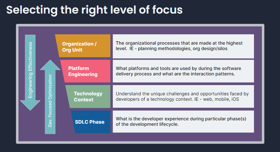 If I am a CIO/CTO looking to get find major productivity improvements, then start with Engineering Effectiveness and work your down the stack. In parallel, I would also start understanding the Developer Experience and work your way up the stack. The top down and bottom up approach will quickly identify areas where Platform and Productivity Engineering can step in and help.