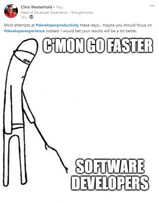 The term Developer Productivity leads me to believe the problem is that developer are not typing fast enough. You can see this with the major push for tools like Copilot, which in my opinion is just a typing accelerator. Valuable, yes. Is it the major problem inside of an organization, no.